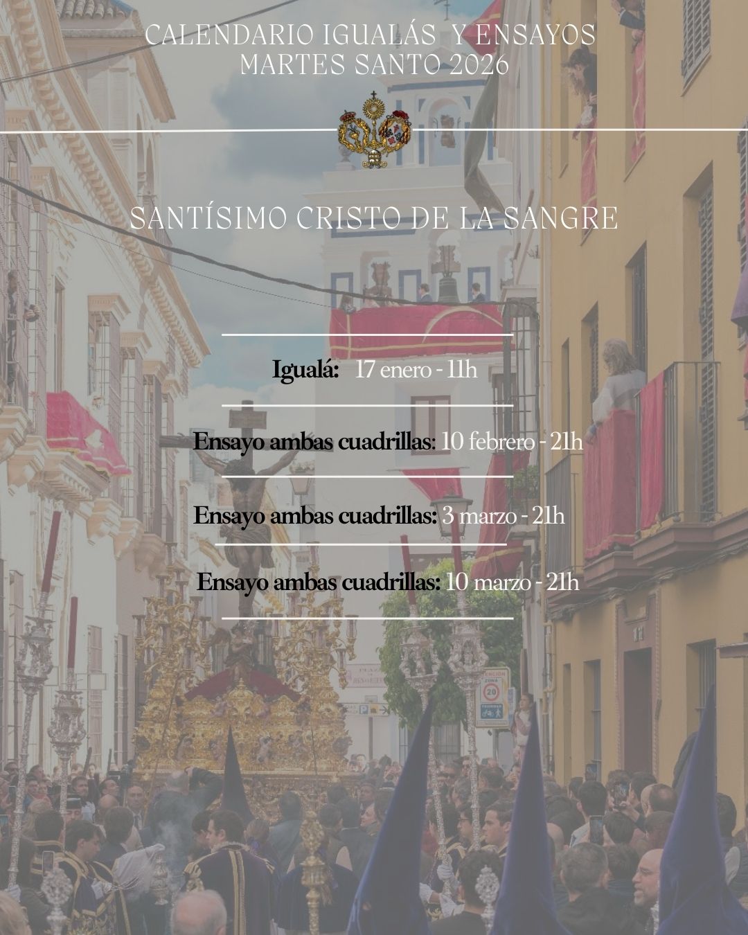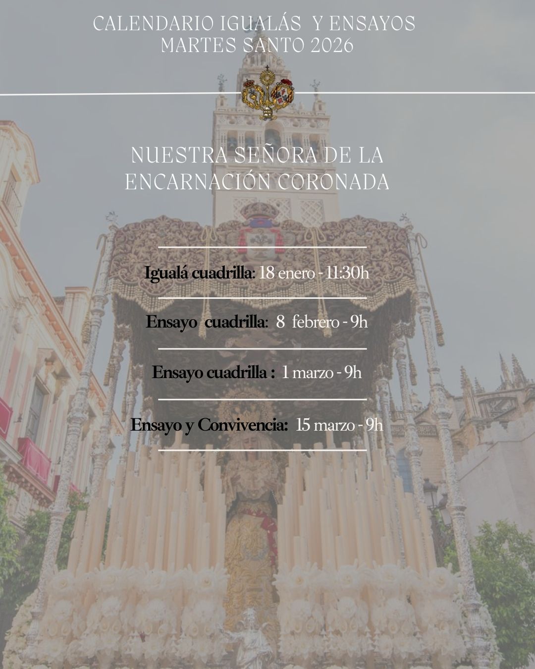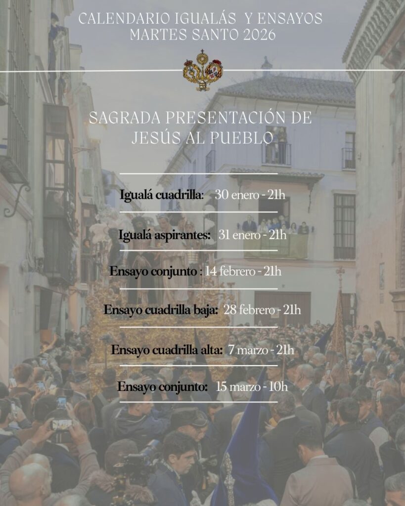 La Hermandad ha hecho públicas las fechas en las que tendrán lugar las igualás y ensayos de los distintos pasos de la cofradía de cara al próximo Martes Santo. Como cada año, estos encuentros marcarán el inicio del trabajo conjunto entre capataces y costaleros, fundamentales para la preparación de la estación de penitencia.