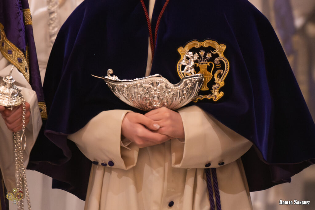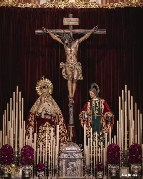 El altar, presidido por el Santísimo Cristo de la Sangre, y acompañado por Nuestra Señora de la Encarnación Coronada y San Juan Evangelista, ofrecía una sobrecogedora estampa del Calvario. El exorno floral, en tonos púrpura, estuvo compuesto por claveles, rosas, barbatus, dendrobium y solomio.