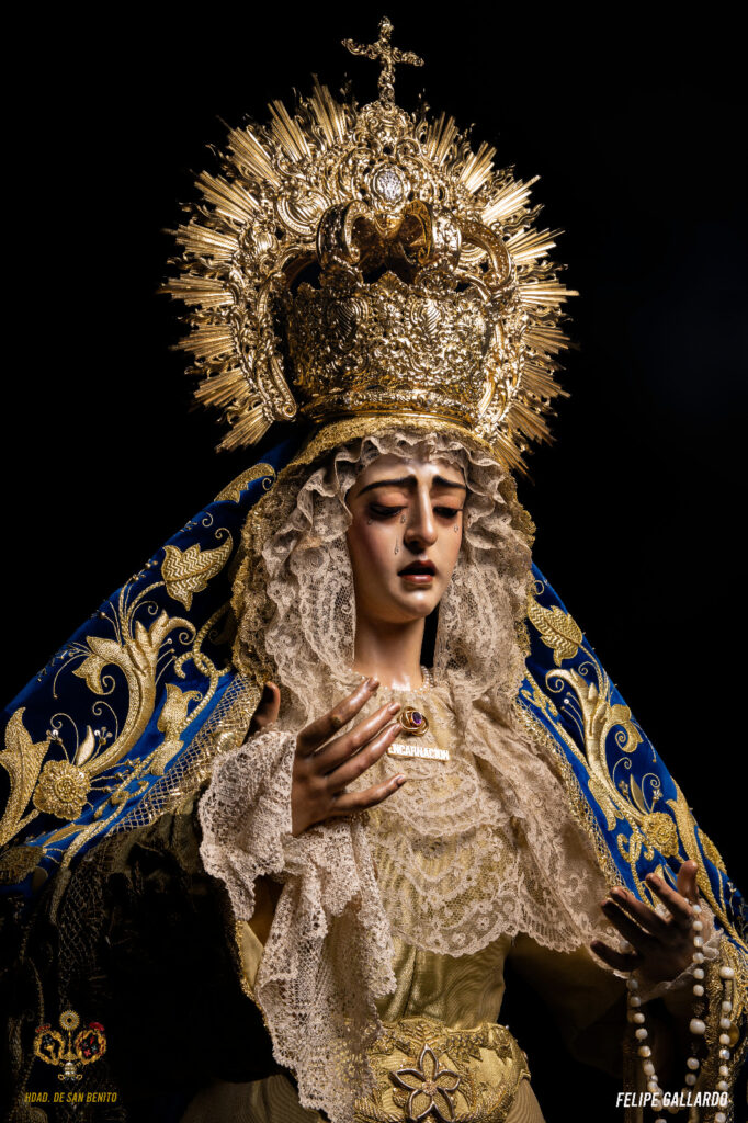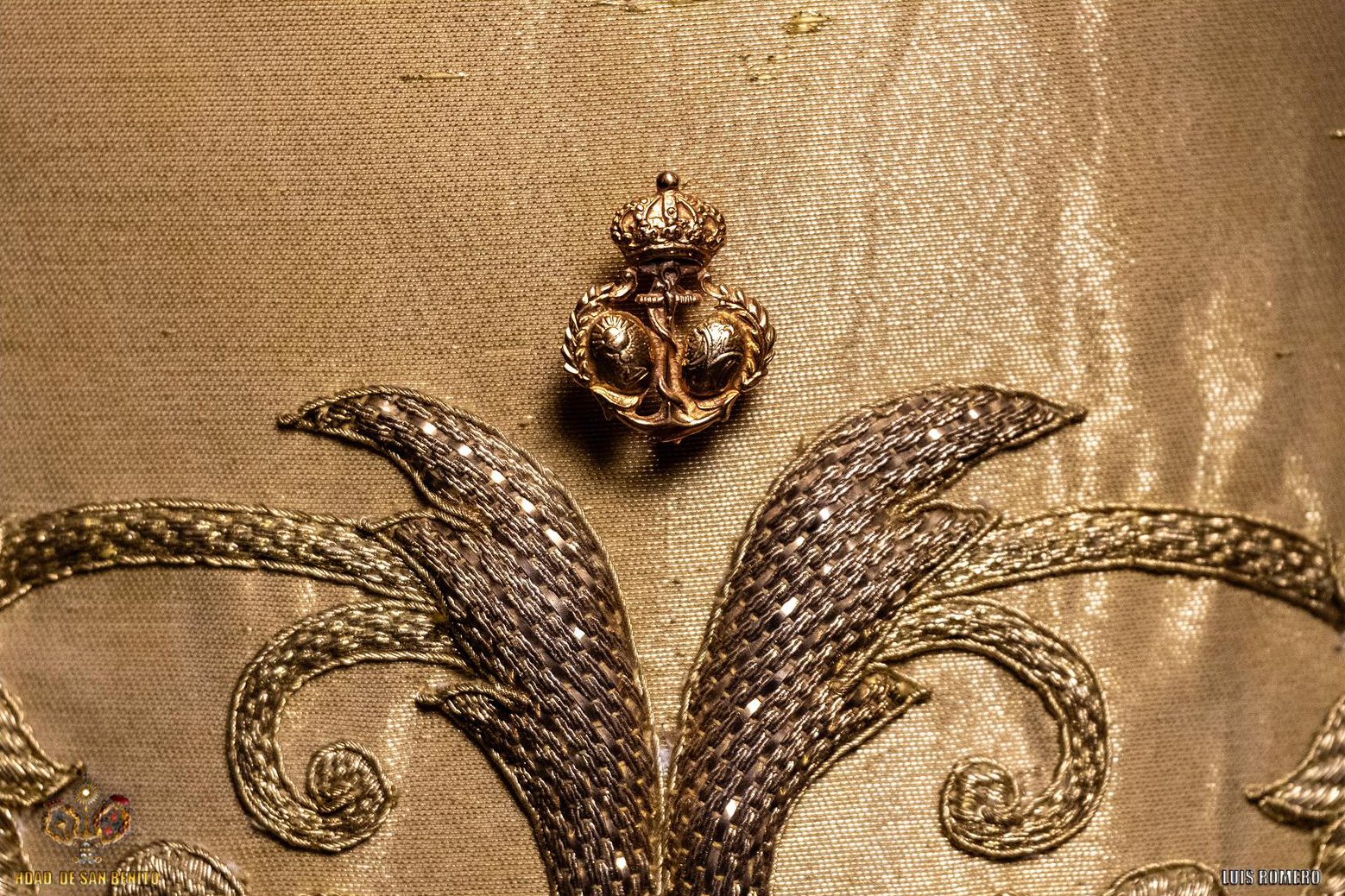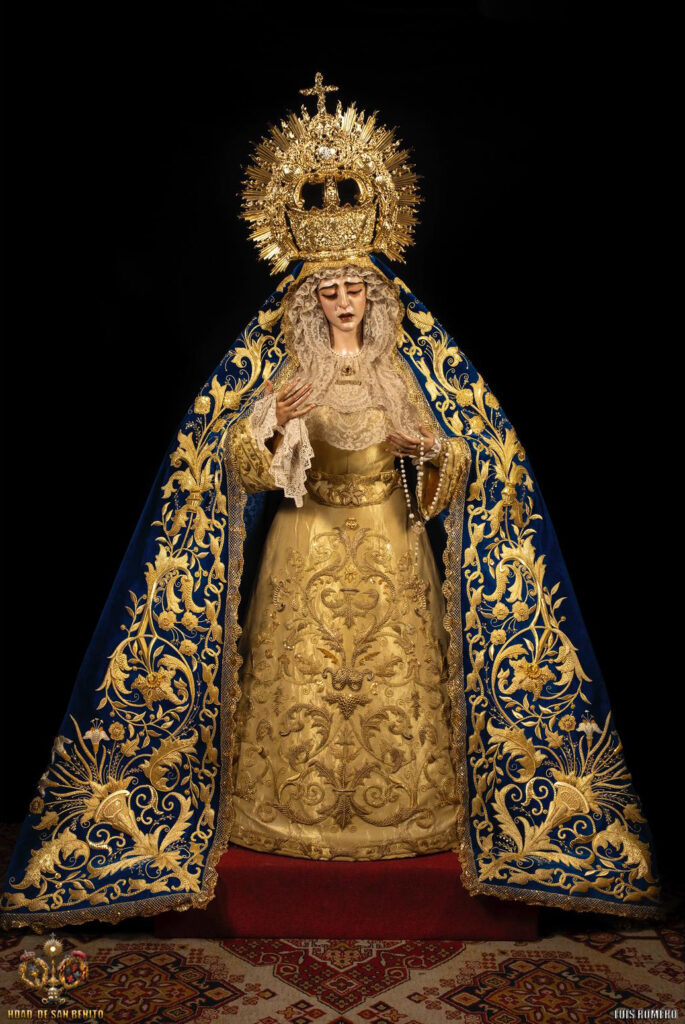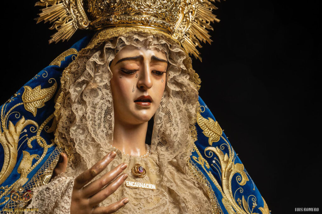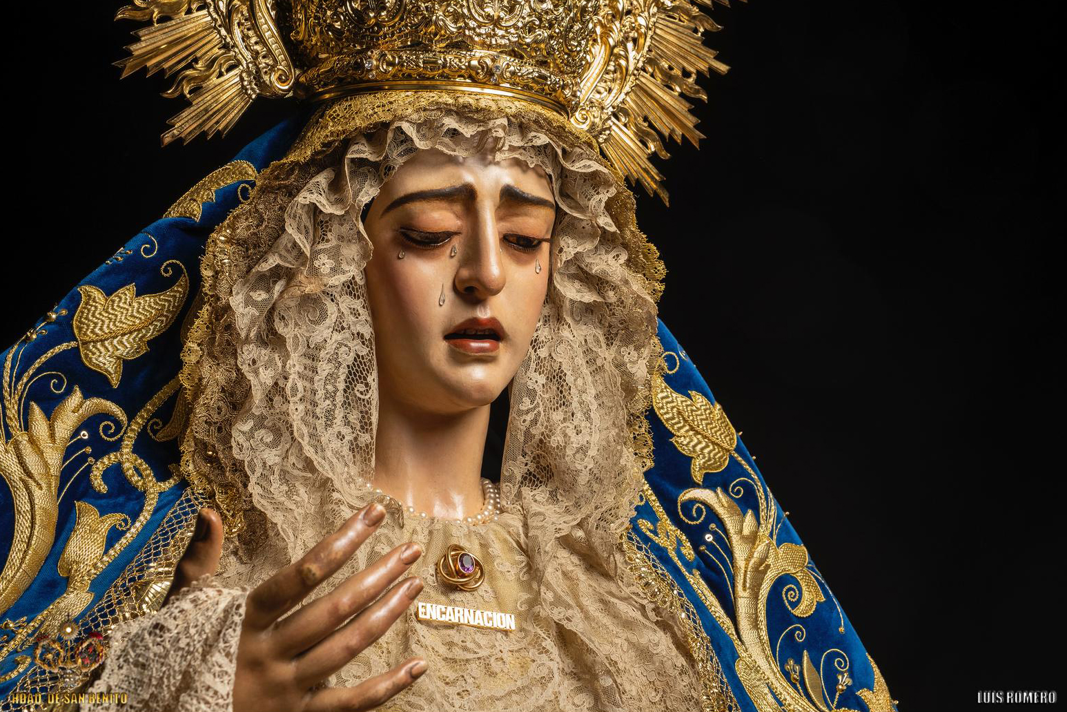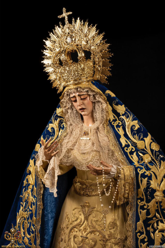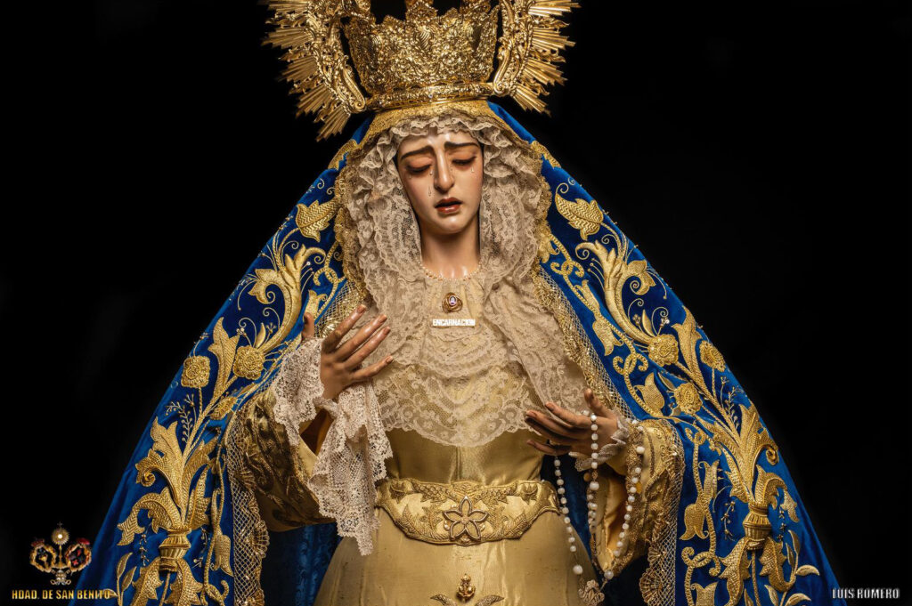 Por su parte, Nuestra Señora de la Encarnación Coronada también se presenta vestida, gracias al buen hacer de Leandro González Ruiz. Porta manto bordado por José Muñoz Moreno, saya de tisú dorado obra de Mariano Martín Santoja y corona de plata de ley sobredorada realizada por Orfebrería Andaluza. Como gesto de comunión fraterna, luce además un broche de oro con el escudo de la Hermandad de la Esperanza de Triana, en honor a la Misión de la Esperanza que se celebra estos días.