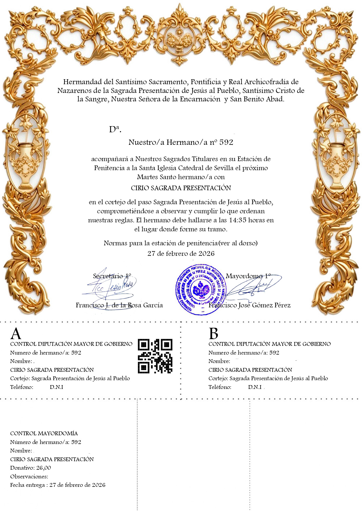 Papeletas de sitio 1968 De 1969 a 1972 De 1973 a 1981 De 1982 a 1983 1984 1985 De 1986 a1989 1990 1991 De 1992 a 1994 De 1995 a 1999 2000 2001 2002 2003 2004 2005 2006 2007 2008 2009 2010 2011 2012 Virgen 2012 Cristo 2012 Misterio 2013 2014 2015 2016 2017 2018 2019 2020 2021 2022 2023 2024 2025 2026 Papeletas de sitio extraordinarias 1991 – Via Crucis Cristo de la Sangre 1992 – Sábado Santo en la Magna Procesión 1994 – Coronación 2003 – 75 Aniversario 2004 – 450 Aniversario 2019 – XXV Aniversario coronación